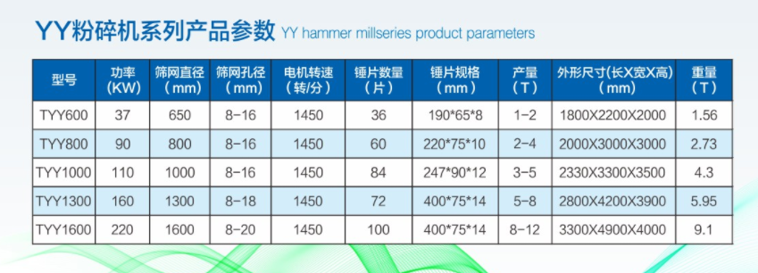 天一元生物質粉碎機采用鋼板焊接結構,電動機與粉碎機安裝在同一底座上,進料口在設備頂部,可與攪龍輸送,皮帶輸送形式的喂料機構相配,錘片為對稱排列。我司生物質粉碎機結構簡單,堅固耐用,噪音小,操作維護方便,產量高、能耗低,價格低。技術參數